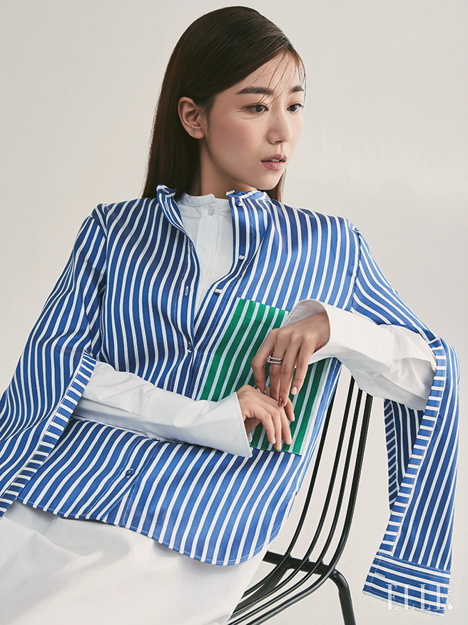 화이트 셔츠 드레스와 포켓 디테일의 스트라이프 셔츠는 모두 Ports 1961. 미니멀한 디자인의 링은 모두 COS.