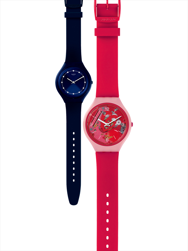그렇게 스킨 컬렉션을 다시 부활시켰죠. 예전과 달라진 점이 있다면 스킨 컬렉션을 통해 스와치가 생각하는 럭셔리가 무엇인지 보여주고 싶었습니다. 20년 전에는 ’세계에서 가장 얇고 가벼운 워치’라는 타이틀을 달고 기네스북에 올랐죠. 무소음과 얇고 가벼운 착용감 등 기존 스킨 컬렉션의 실용적인 면에 섬세하고 우아한 디자인을 새롭게 장착했어요. 가장 큰 포인트는 시계 옆면입니다. 투 톤인데 단순히 페인팅이 아니라 더블 인젝션이라는 기술을 적용한 거예요. 서로 섞이지 않는 두 가지 플라스틱을 마주하는 것은 자석의 양 극을 붙이는 것만큼이나 어려운 일입니다. 이 외에도 용두 부분을 다이아몬드 커팅으로 처리했고, 시계 케이스를 살라미 햄처럼 얇게 하는 등 전반적으로 디테일에 신경 썼습니다.