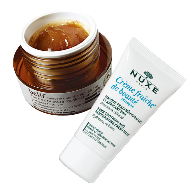 (왼쪽부터) 진정 효과가 탁월한 캐모마일 꽃잎이 듬뿍. 더 트루 팅쳐 마스크 카모마일, 2만8천원, Belif. 수분을 표피층으로 끌어올려 외부 자극에 대한 방어력을 키우는 크렘프레쉬 마스크, 3만원, Nuxe.