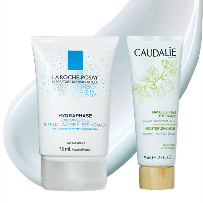 (왼쪽부터) 미생물이 풍부한 온천수가 피부의 방어 기능을 높이는 이드라빠스 슬리핑 마스크, 3만6천원대, La Roche-Posay. 홍조 감소 효과에 도움을 주는 강력 수분 진정 팩. 모이스처라이징 마스크, 3만7천원, Caudalie.