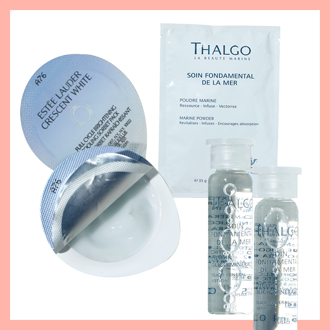 (왼쪽부터) 청량감이 가득한 향과 텍스처. 크레센트 화이트 풀 사이클 브라이트닝 쿨링 소르베 팩, 8개 10만원대, Estee Lauder. 얼굴에서 줄줄 흘러내리지 않고 촉촉하게 굳는 마린 인퓨전 마스크, 12세트 가격 미정, Thalgo.