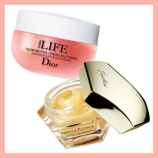 과일산 성분이 든 젤리 텍스처가 각질은 제거하고 수분을 공급하는 하이드라라이프 글로우 베터 프레쉬 젤리 마스크, 8만2천원대, Dior. 벌꿀 같은 젤 제형으로 그대로 흡수시켜도 무방한 아베이 로얄 허니 젤 마스크, 19만8천원대, Guerlain.