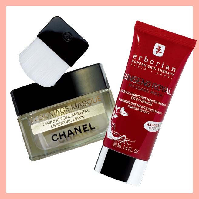 (왼쪽부터) 감미로운 버터 크림을 얼굴에 바르는 듯 묵직한 영양감의 수블리마지 에센셜 마스크, 26만5천원, Chanel. 6년산 홍삼 복합체가 든 온열 팩을 발라 1분간 마사지하는 것으로도 톤업 효과가 탁월한 진생 로얄 마사지 마스크, 5만9천원, Erborian.