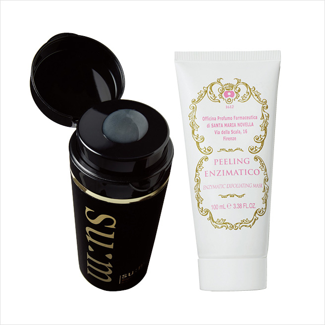 (왼쪽부터) 피부에 도톰히 바르면 보글보글 거품이 생기며 모공 속을 청소하고 안색을 개선한다. 브라이트 어워드 버블-디 마스크 블랙, 5만원, Su:m 37°. 녹말에서 얻은 미세 효소가 자극 없이 모공 속의 노폐물을 딥 클렌징하는 필링 엔지마티코, 14만5천원, Santa Maria Novella.