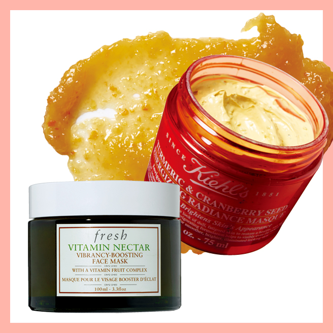 (왼쪽부터) 오렌지를 으깨 넣은 듯한 상큼함으로 생기를 급속 충전. 바이타민 넥타 바이브런시 부스팅 페이스 마스크, 9만원대, Fresh. 크랜베리 씨앗이 부드럽게 각질을 정돈하는 효과. 해외에서 내추럴 항산화 식물로 각광받는 강황이 듬뿍 든 크랜베리 생기 충전 마스크, 3만8천원대, Kiehl’s.