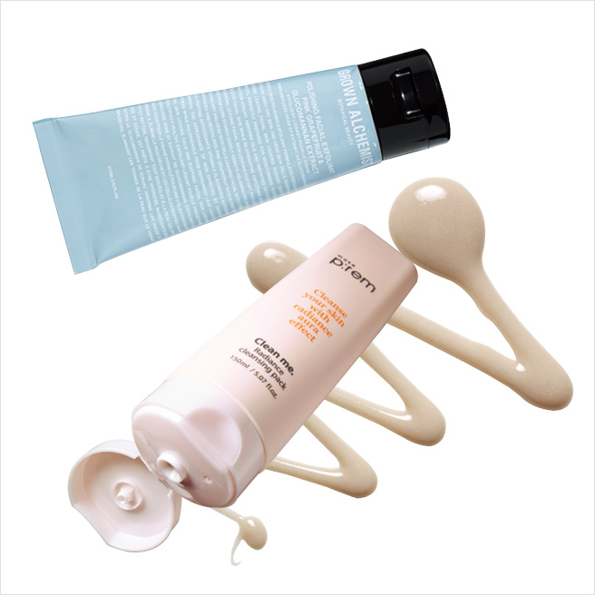 (위쪽부터) 미세한 알갱이가 들어 있어 바르면서 부드럽게 롤링한 뒤 잠시 기다렸다 헹굴 것. 폴리싱 페이셜 엑스폴리언트, 6만7천원, Grown Alchemist by La Perva. 미리 세안할 필요 없이 도톰하게 발랐다가 헹궈내면 끝. 클린 미 래디언스 클렌징 팩, 2만원대, Make P:rem.