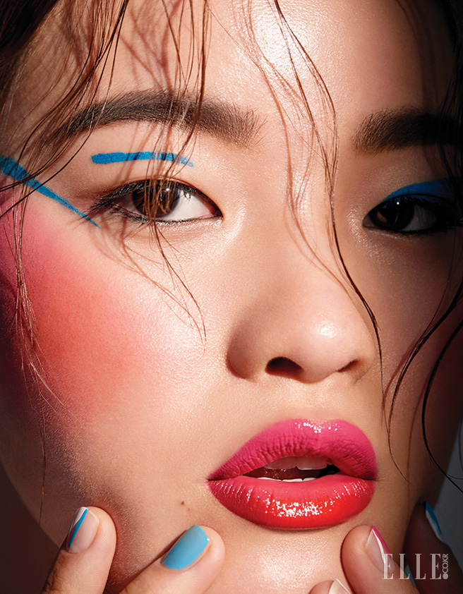 윤기 넘치는 피부를 위해 쉬어 글로우 파운데이션, 몽블랑과 샬롯 갱스부르 컬렉션 하이드레이팅 글로우 틴트, 라이트를 믹스해 바른다. 선명한 터키 블루색 벨벳 아이라이너, 퀴라소로 한쪽엔 툭 끊어진 두 개의 라인을, 반대쪽엔 날렵한 캐츠 라인을 그려 좌우 대칭을 이뤄야 한다는 선입견을 깰 것. 매트한 레드 컬러의 블러쉬, 익지빗 에이와 비비드한 핑크빛의 블러쉬, 게이어티를 광대뼈 앞쪽과 뒤쪽에 각각 발라 두 톤이 동시에 드러나도록 한다. 마찬가지로 윗입술엔 벨벳 립 글라이드, 마인섀프트를, 아래 입술엔 벨벳 립 글라이드, No.54를 발라 재미를 더한다. 사용 제품은 모두 Nars.