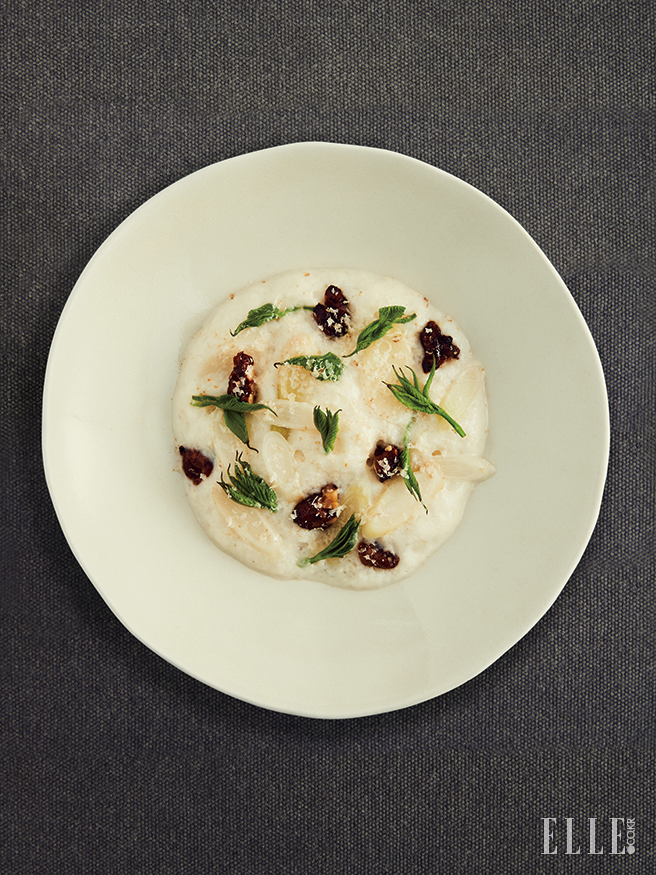 따듯한 염소유 거품과 살짝 소금 간을 한 두릅을 수프처럼 담고 위에 두릅 잎, 설탕에 조린 호두와 신선한 호두를 부숴 올린다.
