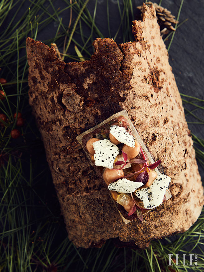 훈연한 배를 얇게 저며서 그릇처럼 깔고 그 위에 타르타르로 다진 생사슴고기를 올린 후, 달걀노른자 퓌레를 조금씩 짜서 장식한다. 맨 위에 부숴서 꽂은 머랭은 맥주로 만든 것. 고소한 풍미를 더한다.