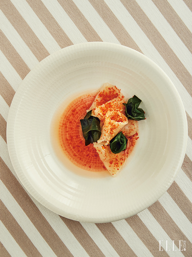 키조개를 물김치에 5일간 담가 숙성시키면 ‘슈퍼 소프트’한 질감이 된다. 키조개를 말아 꽃모양으로 놓고 불린 미역을 함께 세팅한다. 그 위에 말린 키조개와 말린 알을 강판에 갈아 가루로 만들어 뿌린다. 마무리는 물김치 국물을 자작하게 붓는 것.