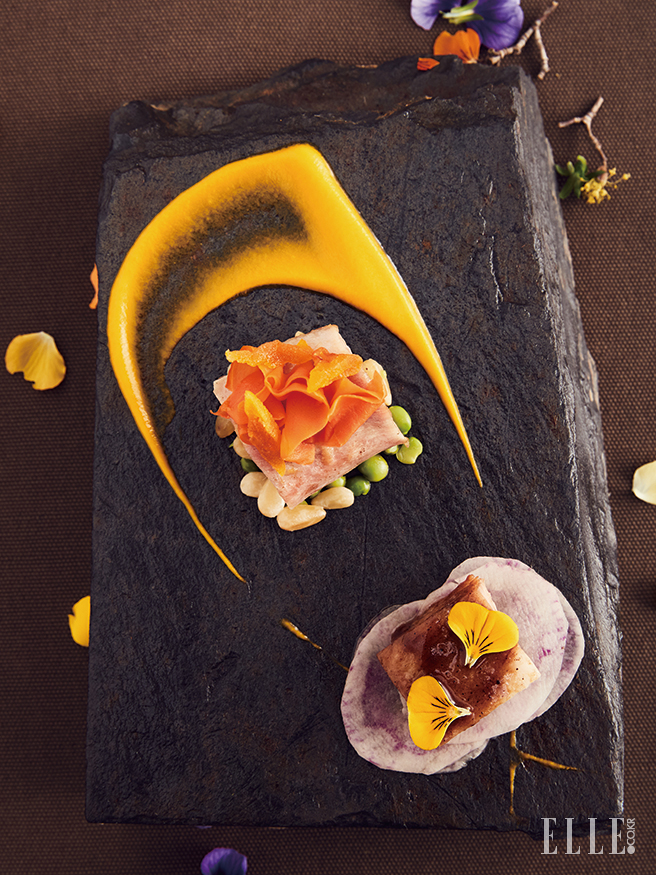 그는 한식 조리에서 재료를 쓰는 방식이 거의 정해져 있고, 파인 다이닝으로 가면 갑자기 격식에 짓눌리는 게 안타까웠다. 파인 다이닝이라도 충분히 가볍고 재미있는 시도들을 해보고 싶었다. 한국적인 음식으로 당연하게 김치나 밥류, 장이나 젓갈을 떠올렸다면 그 역시 선입견이다. 조셉이 <엘르>를 위해 선택한 재료는 사슴고기, 토끼고기, 키조개 등으로 토종 한국인조차 바로 떠올릴 수 없는 식재료였다. 그가 낯선 한국산 재료들을 모던하게 해석한 파인 다이닝은 팝업 레스토랑 형태로 서울 곳곳에서 기습적으로 만날 수 있다. 4월엔 이태원이었지만, 5월에는 또 어딘가에서 열리겠지. 그의 인스타그램(@josephkorea)을 수시로 염탐하면 그가 차린 테이블을 만날 수 있다.