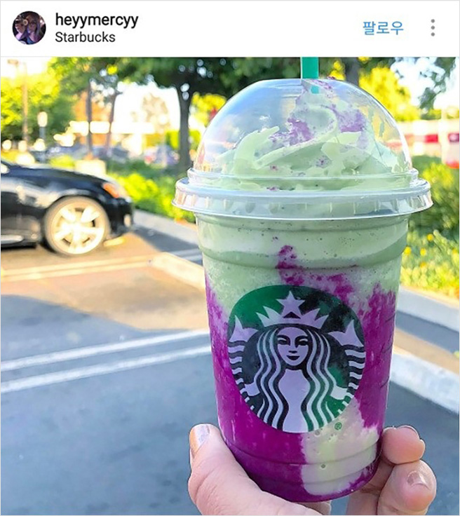 스타벅스에서 유니콘 프라푸치노, 유니콘 레몬에이드에 이어 선보인 드레곤 프라푸치노.녹차 프라푸치노에 바닐라 파우더와 핑크빛 파우더가 들어갔다. 정식 판매되는 메뉴는 아니며 미국 전역에서 개인 주문 시 가능하다고.