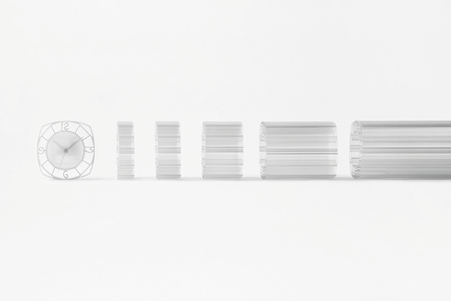 오키 사토가 이끄는 디자인 스튜디오 넨도는 올해 질 샌더와 <인비저블 아우트라인> 전시, 파네라이와 ‘시간의 조각’ 설치미술 작품을 내놓았다. <인비저블 아우트라인>은 볼펜으로 낙서한 듯 끊임없는 동심원을 입체적으로 설치했는데, 무의식적으로 외곽선을 따라 객체를 인지하는 인간의 경향을 꼬집어 윤곽선을 흐릿하게 해 내외부를 모호하게 만드는 작업. ‘시간의 조각’은 16m 길이의 텅 빈 플라스틱 관을 조각조각 잘라내면서 잘라진 조각에 폴리싱, 샌드블라스트 등 시계를 진짜로 만들어내는 과정을 톱니바퀴처럼 거쳐가면서 설치 말미에 도달하면 시계가 만들어지도록 해 인간이 시계로 시간을 분할해 온 긴 역사를 은유한다.