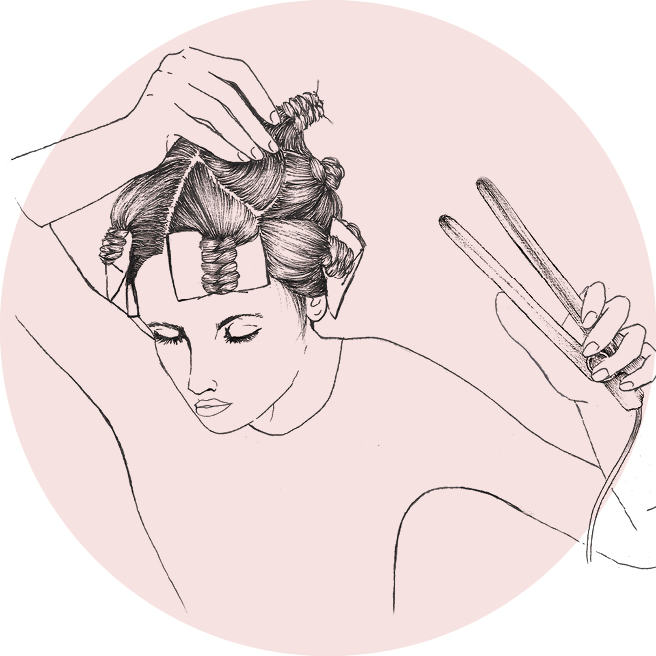스트레이트용 판 고데기로 각각의 타래 핀에 약 1분씩 열을 가한다. 미리 열 보호 스프레이를 뿌려주면 모발 손상을 줄일 수 있다.