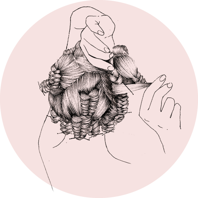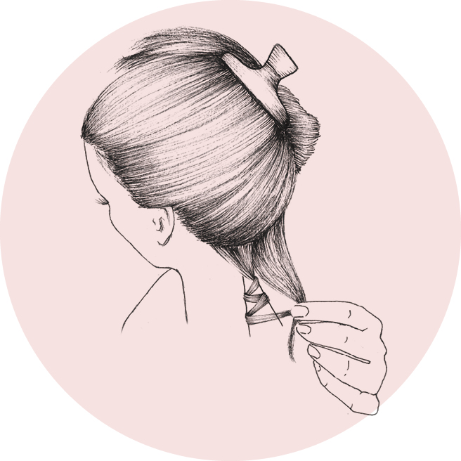 목덜미 부근의 모발을 일부 남긴 채 나머지는 집게 핀으로 고정시킨다. U핀의 구부러진 부분이 위를 향하도록 하고 핀 사이로 분리한 모발 일부를 넣어준다. 그 다음 모발을 왼쪽에서 오른쪽 방향으로, 핀 앞뒤로 통과시킬 것. 마지막으로 핀 끝을 서로 교차시켜 머리 타래를 고정한다.