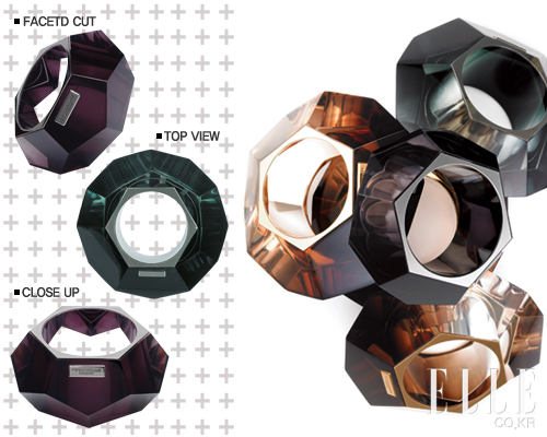 The Facets Bangles by Burberry Prorsum 크리스토퍼 베일리는 153년의 유구한 전통을 지닌 버버리 하우스의 아카이브를 모던하게 재해석한 이번 시즌 컬렉션을 ‘트위스티드 클래식(twisted classic)’이라 명명했다. 트렌치 코트와 버버리 체크 등 트래디셔널 아이템을 풍성한 리프 매듭(맞 매듭)과 파스텔 컬러로 장식해 달콤한 로맨티시즘을 연출한 것. 숄더와 헴라인의 리프 매듭 디테일로 볼륨감을 더한 트렌치코트는 페퍼민트, 프로스트 핑크, 허니 등 러블리한 컬러를 입었고, 에어리한 튤 스커트는 글리터링한 크리스털 톱과 어우러져 라이트한 ‘모던 클래식’을 선보였다. 매시즌 컬렉션을 함축한 커스텀 주얼리를 선보여온 크리스토퍼 베일리는 이번 시즌 역시 파세티드 뱅글로 컬렉션을 상징했는데, 파세티드 컷의 속이 비치는 데크라데 컬러 글라스 뱅글은 마치 크리스털처럼 빛을 반사하며 투영하게 반짝이는 클래식 로맨티시즘을 표현한다. 버버리 프로섬 뱅글 \780,000 플렉시글라스, 메탈 소재. |