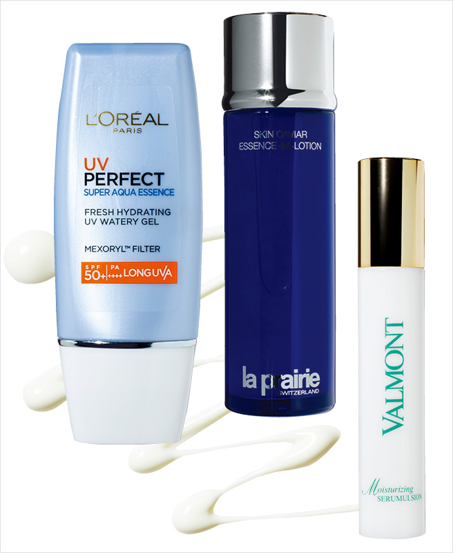 촉촉한 수분 에센스를 더해 로션처럼 가벼운 유브이 퍼펙트 슈퍼 아쿠아 에센스 SPF 50+/PA+++, 2만5천원대, L’Oreal Paris.