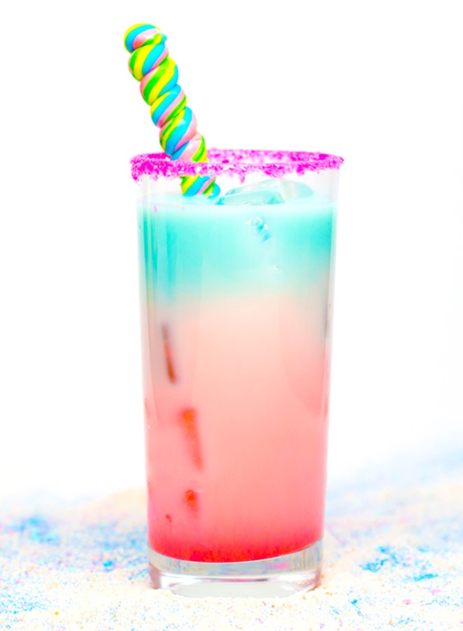 하이볼 잔 테두리에 핑크색 식용 글리터를 부착한다. 잔에 얼음을 넣고 코코넛 워터 170g과 캡틴 몰건 로코넛(Captain Morgan LocoNut) 55g을 넣는다. 빨대나 스푼으로 저은 후, 그레나딘 시럽 7g을 뿌려 아래로 가라앉도록 한다. 마지막으로 큐라소 리큐르를 7g 뿌려준다. 유니콘 뿔을 상징하는 무지개 롤리팝을 꽂아 완성.