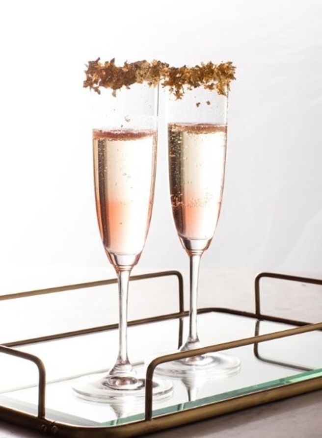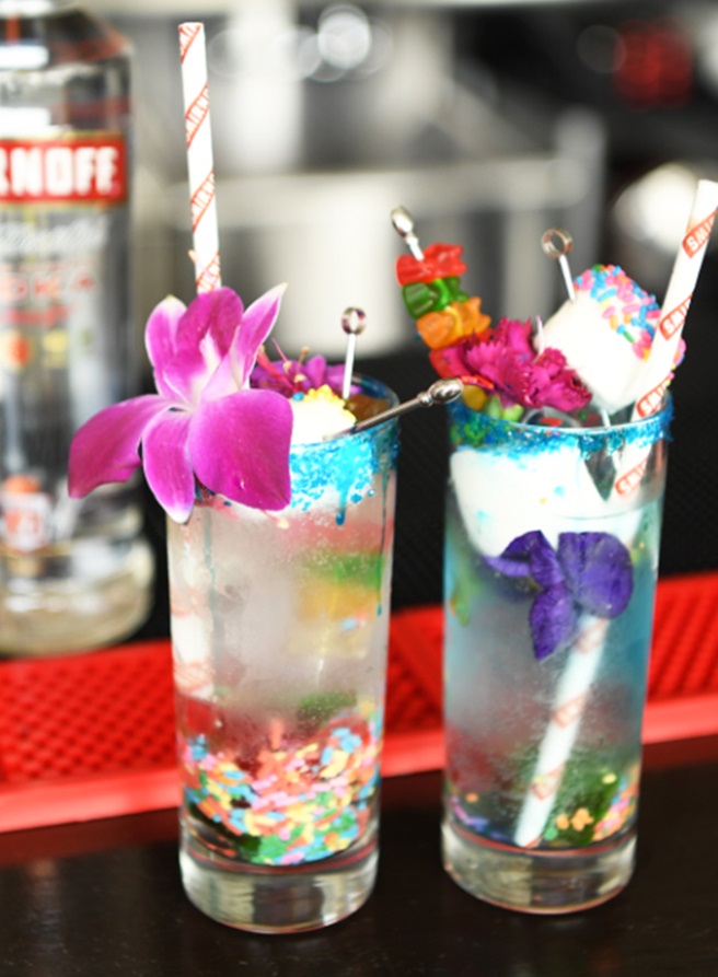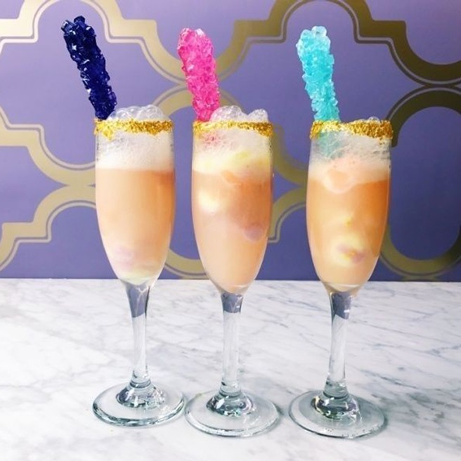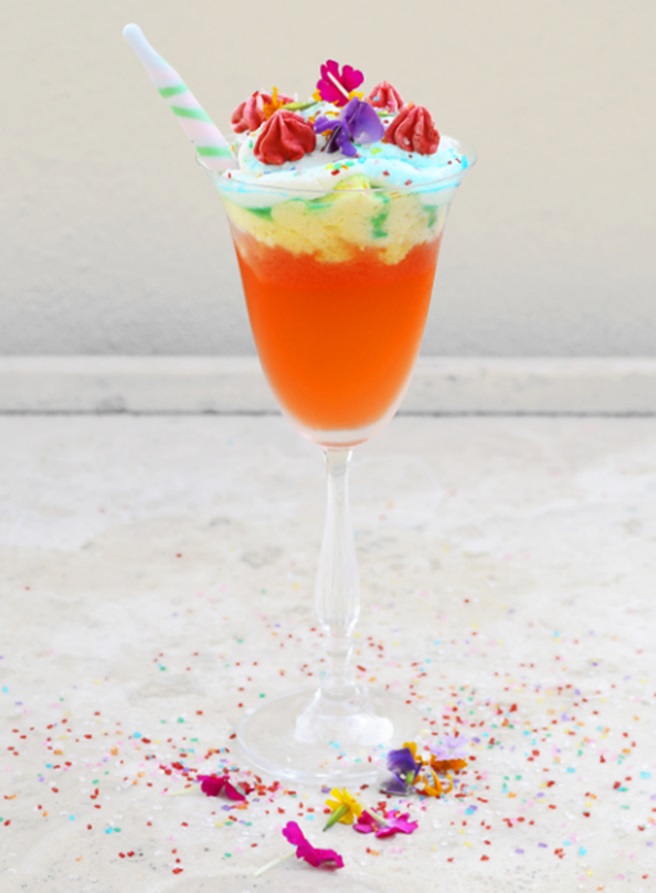 샴페인 잔 입구를 물에 담갔다 빼고 식용 글리터를 테두리에 붙인다. 셔벗 3 스쿱과 보드카 42g, 샴페인 42g을 잔에 붓고 알록달록한 얼음사탕으로 장식을 한다.