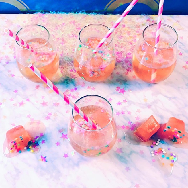 얼음 틀 각 칸에 스프링클을 1 작은 숟갈씩 넣고 로제 와인을 부어 하룻밤 얼린다. 샴페인을 따른 잔에 이 로 제와인 얼음을 넣어 낸다.