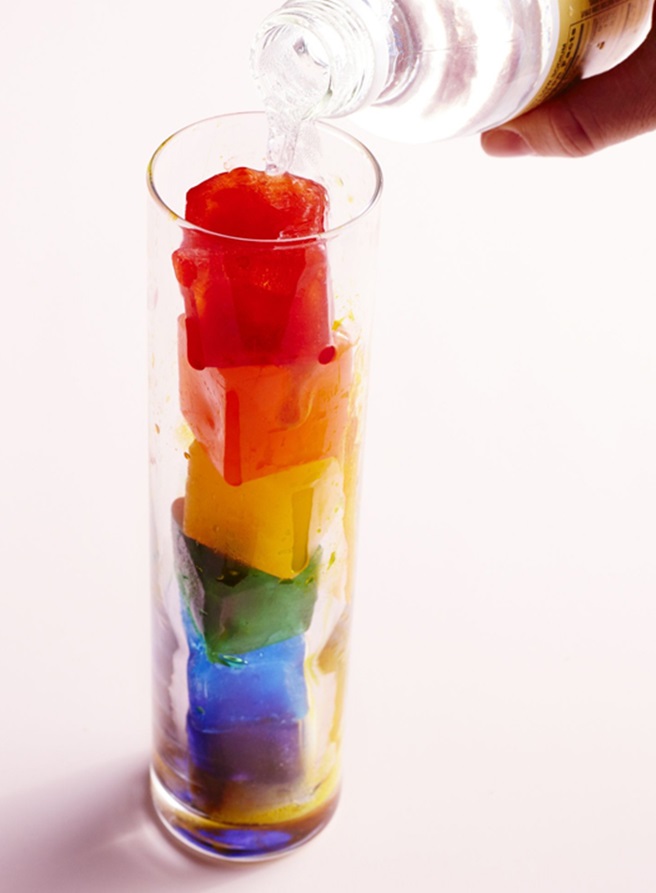 계량컵에 빨강, 주황, 노랑, 초록, 파랑, 혹은 보라색 식용색소를 각 6방울씩 담는다. (접시마다 한 가지 컬러만 사용할 것.) 이를 실리콘 얼음 틀에 부어 각 컬러 별로 얼음을 한 개씩 만들어두도록 한다. 얼음이 언 후에는, 콜린스 잔에 다음의 순서로 넣는다: 보라, 파랑, 초록, 노랑, 주황, 그리고 빨강. 앱솔루트에 민트 잎과 얼음을 넣어 가볍게 섞은 후, 무지개 빛 얼음을 차례로 담아놓은 잔에 붓는다. 마지막으로 탄산수를 붓는다.