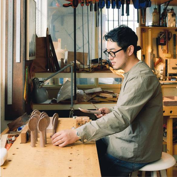 가지런히 정리한 우드 카빙 도구 앞에서 스푼을 깎고 있는 김혜윤 작가.
