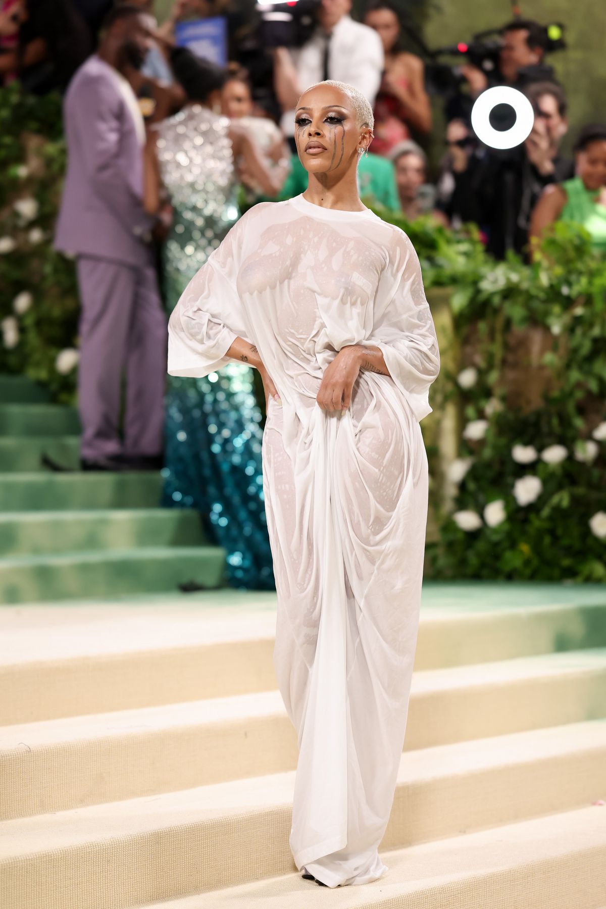 도자캣의 정원엔 비가 내렸나 봅니다. 어쩌면 샤워를 막 끝낸 참일지도 모르죠! 흠뻑 젖어 속이 비치는 오버사이즈 티셔츠 형태의 드레스를 입고 메트로 폴리탄 뮤지엄에 도착한 도자캣. 스모키 메이크업과 마스카라가 흘러내리는 듯한 실버 글리터 메이크업은 영국 출신의 메이크업 아티스트 팻 맥그라스의 손끝에서 완성됐습니다. 도자캣(Doja Cat)