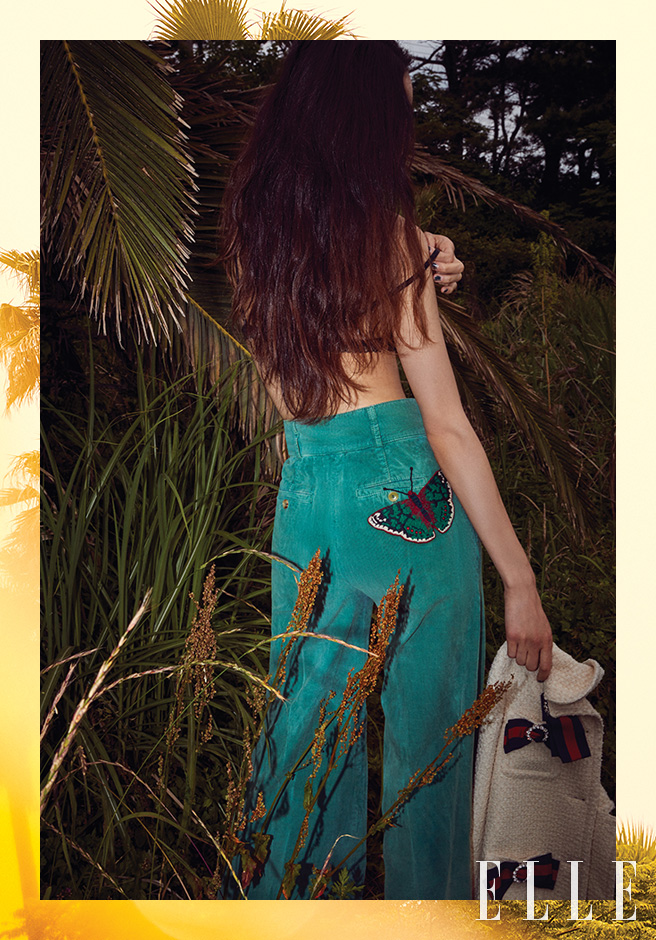 나비 모양의 아플리케 자수가 돋보이는 코듀로이 팬츠는 1백25만원, 리본 장식의 화이트 재킷은 3백85만원, 모두 Gucci.