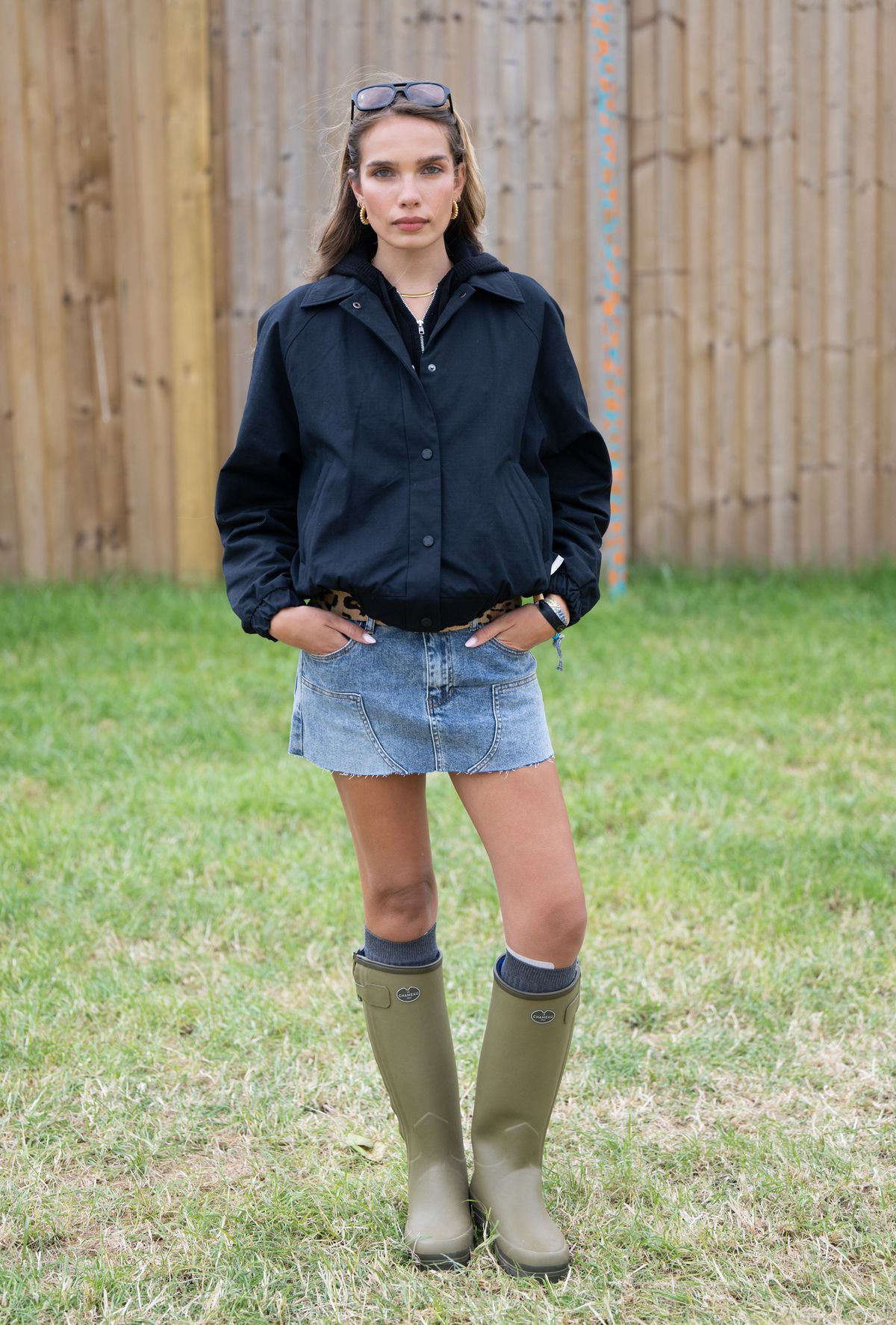 모델 하나 크로스는 후디와 바람막이 재킷, 데님 스커트에 무릎까지 오는 레인부츠, 언뜻 보이는 레오퍼드 패턴의 벨트로 쿨한 페스티벌 패션을 완성했습니다. 그의 룩을 참고해 장마철에 활용해보면 어떨까요?