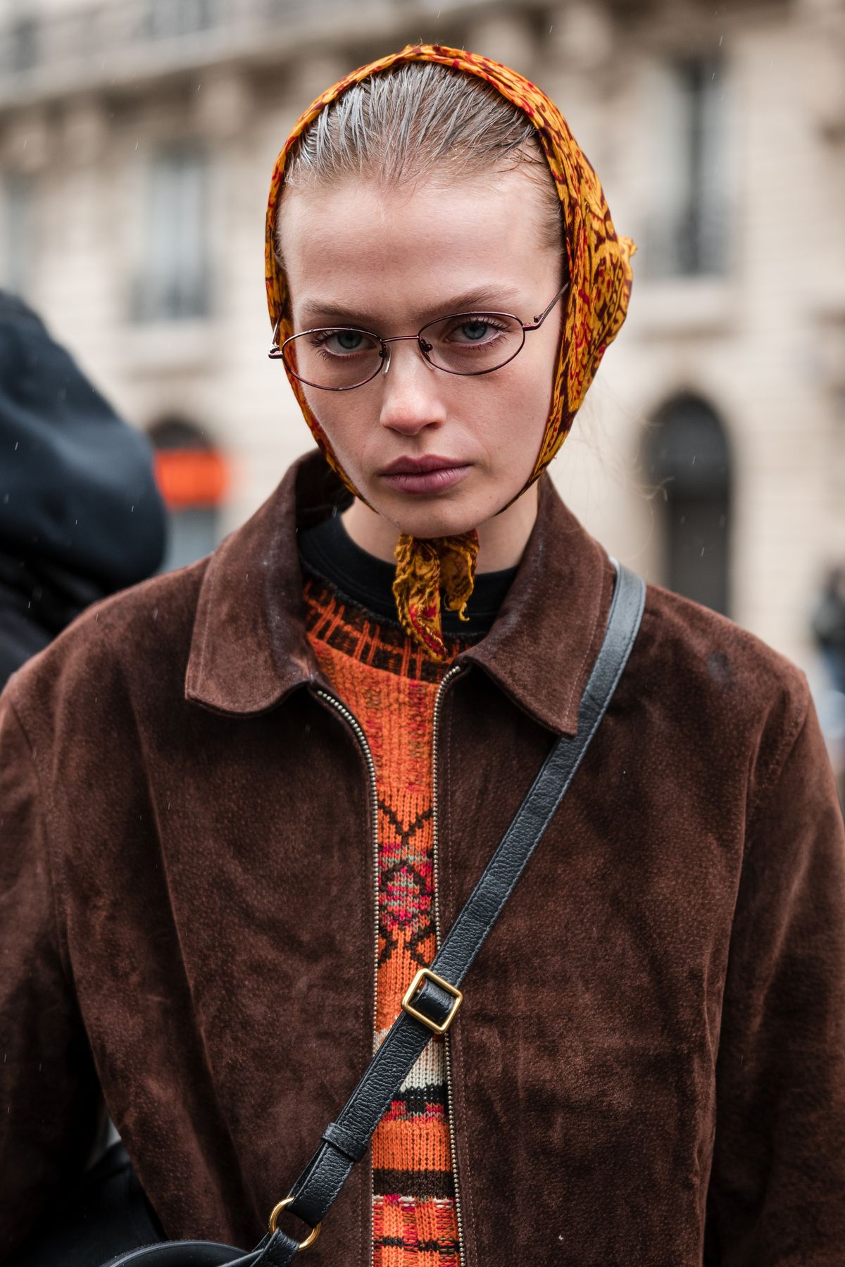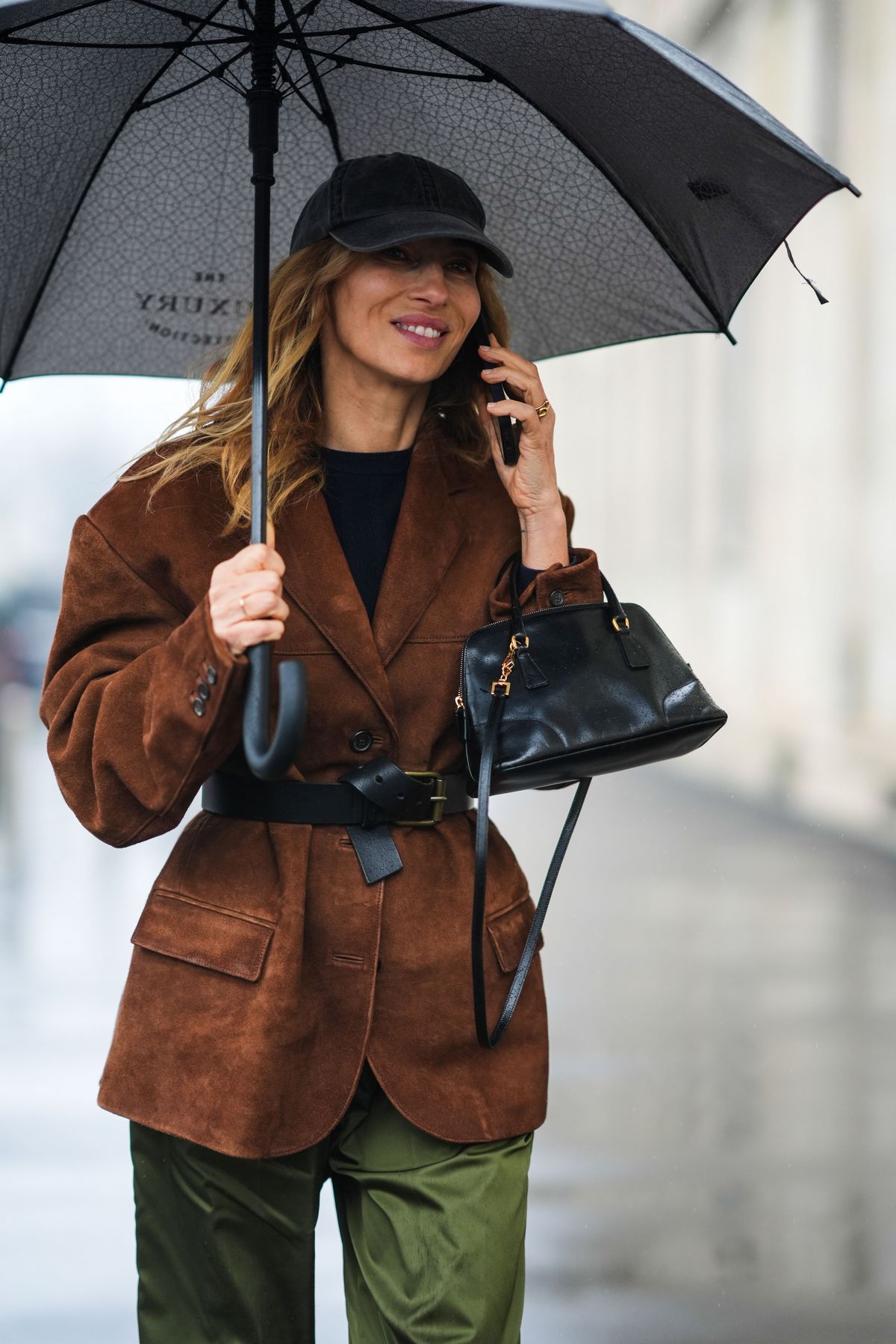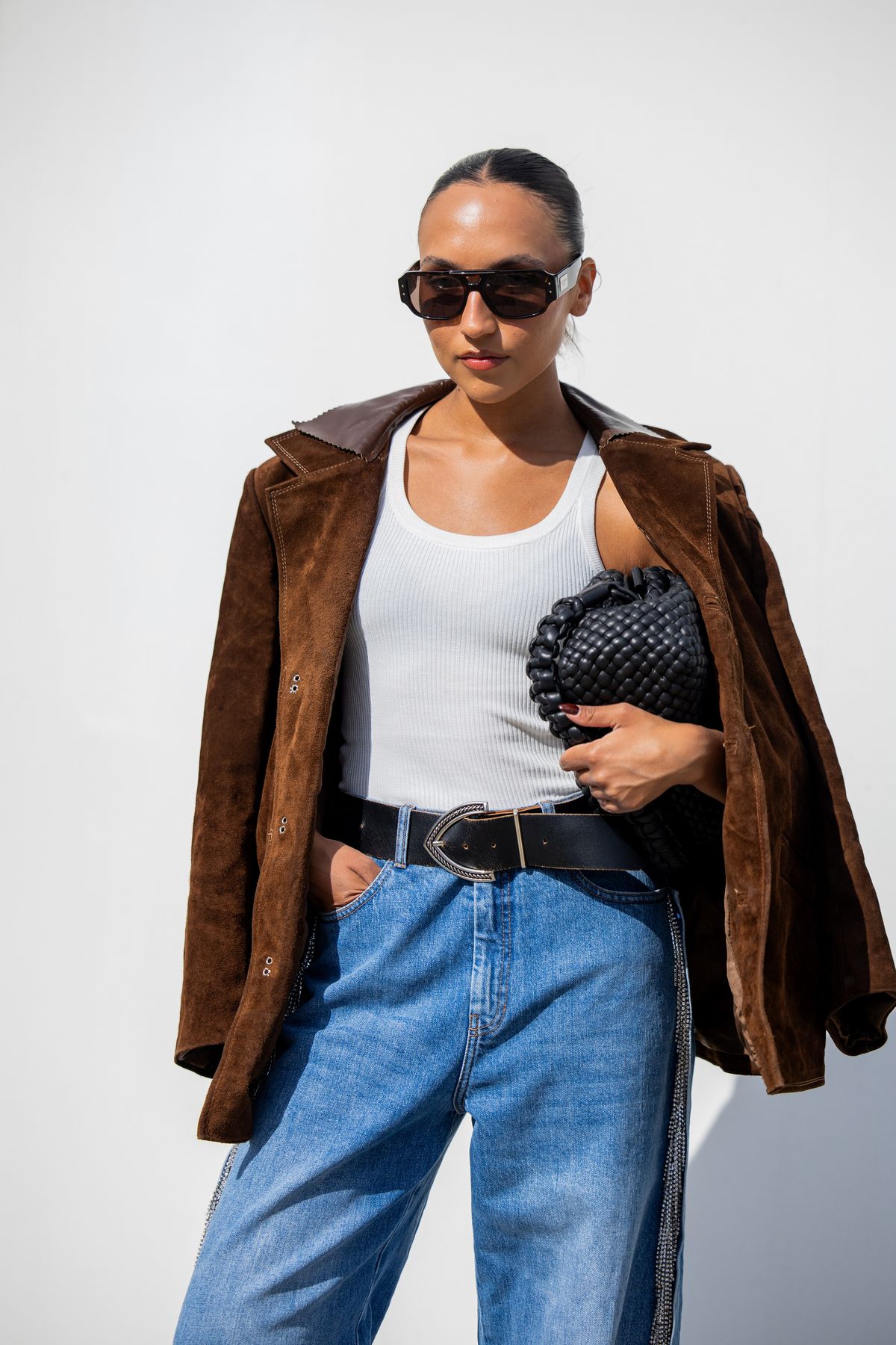 머리에 무심하게 연출한 프린트 스카프, 박시한 실루엣과 대비되게 허리에 두른 벨트와 캐주얼한 볼캡은 스웨이드 재킷 룩을 보다 다채롭게 입을 수 있게 해주는 액세서리입니다.