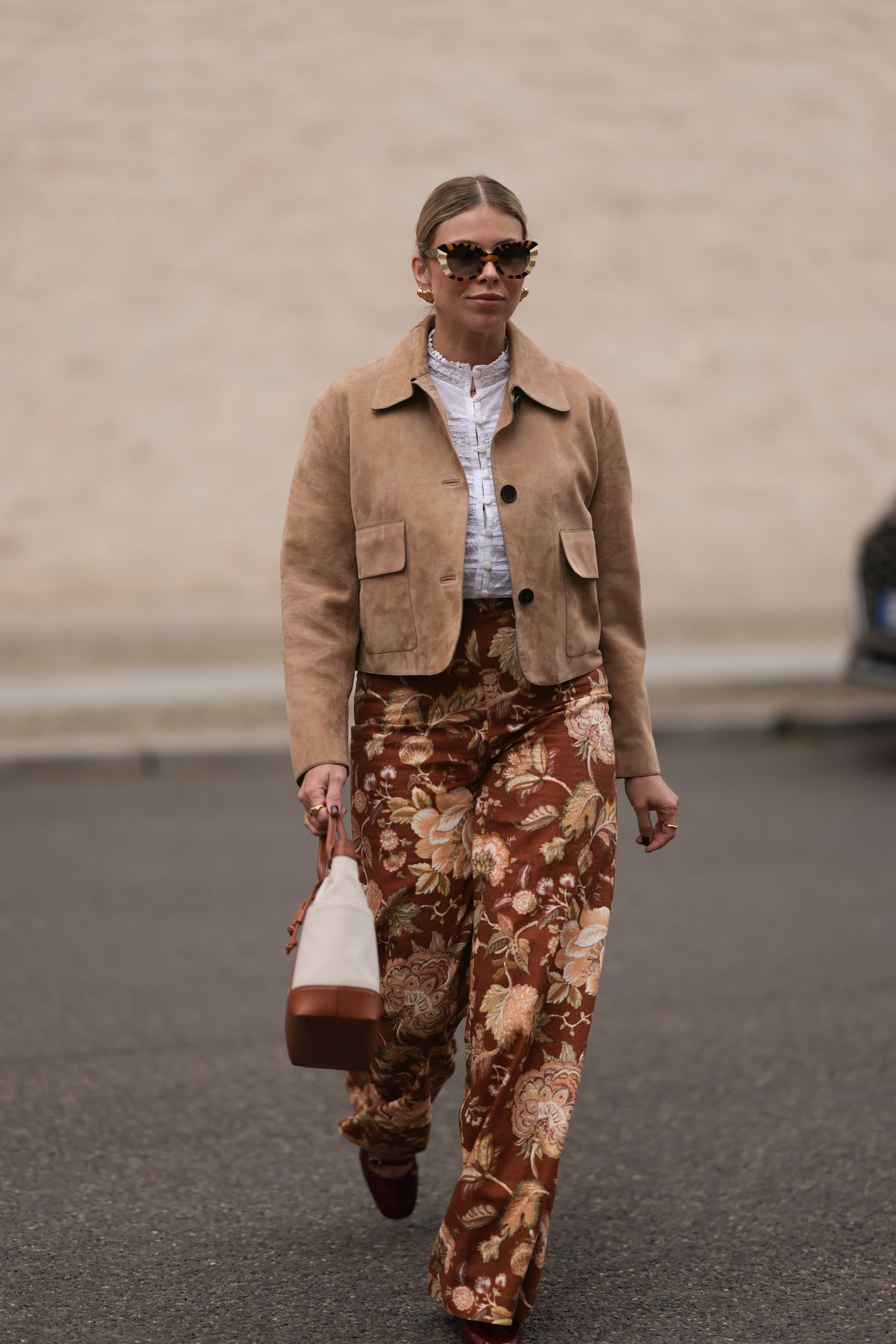 스웨이드 재킷을 화려한 컬러와 프린트 패턴의 하의와 스타일링해 보면 어떨까요? 여름에서 가을로 넘어가는 문턱에 은은한 가을의 분위는 물론 밝고 화사한 기분까지 느낄 수 있으니 말이죠.