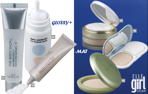 glossy 1 UV 언더베이스 무스. 65g. 5만원. 슈에무라. 2 스킨 프라이머 매트 잇. 25ml. 2만2천원. 더바디샵. 3 파운데이션 프라이머 미네랄. 50ml. 4만8천원. 로라 메르시에.