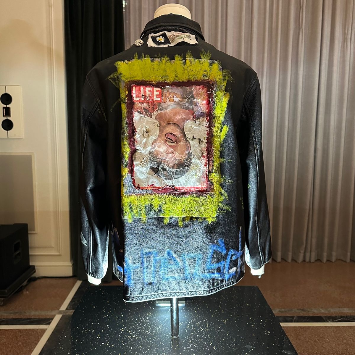 2일 선공개된 옥션에서는 약 20점의 작품들이 공개됐습니다. 먼저 눈에 띄는 건 지드래곤이 제작한 가죽 재킷입니다. 얌전한 앞부분과 달리 뒷부분은 지드래곤의 예술혼(?)이 잔뜩 담겨 강렬한 인상을 줍니다. 자신이 등장하는 매거진 <LIFE> 표지를 재킷 뒷부분에 콜라주하고, 컷아웃된 목 부분에는 그의 브랜드 '피스마이너스원(PEACEMINUSONE)'의 상징인 데이지 패치를 노출했습니다. 또 독일 사상가 프리드리히 니체가 제시한 인간상, '초인'을 일컫는 'Übermensch'가 재킷 하단에 페인팅돼 있네요.
