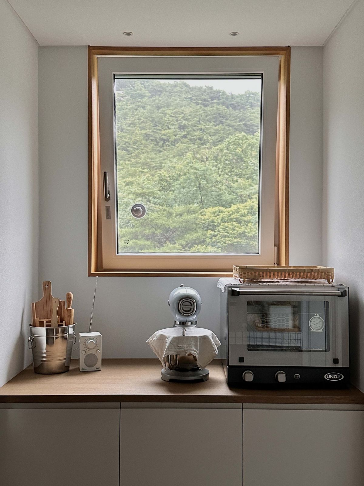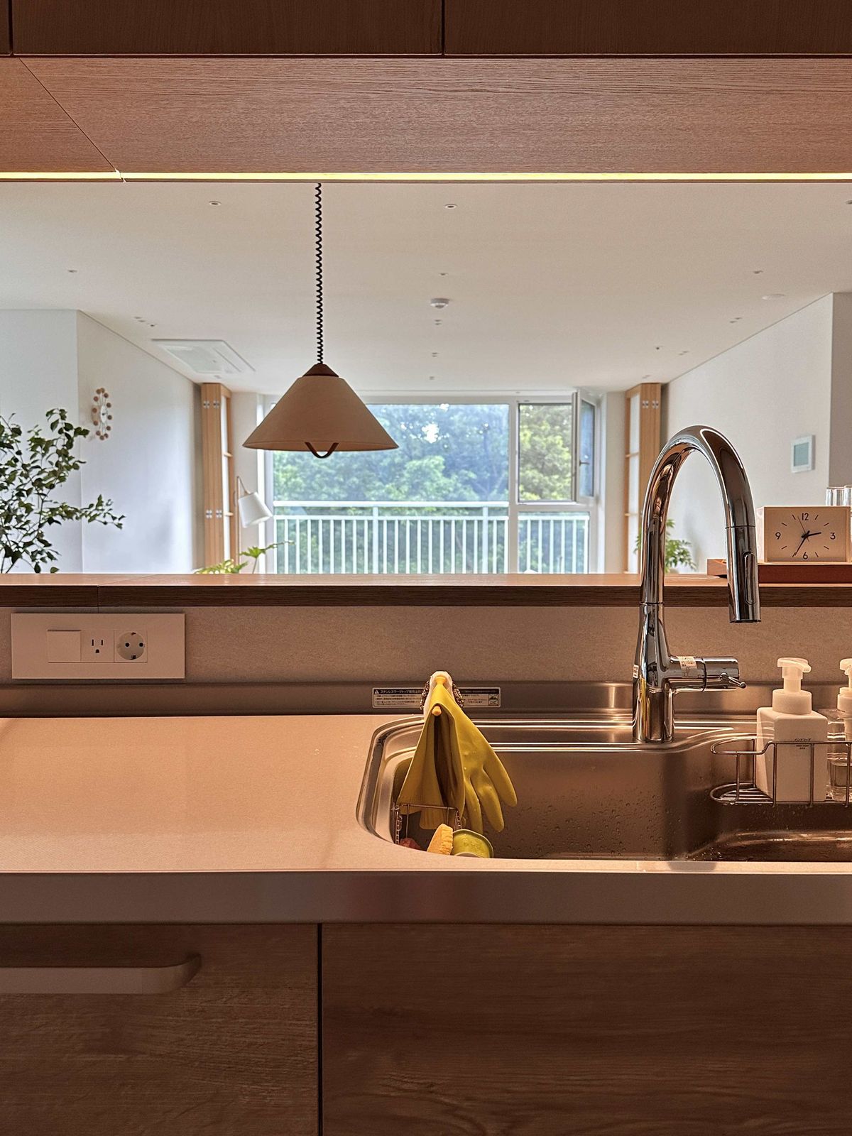 싱크대 앞에 서면 거실 창으로 푸르른 숲 뷰가 펼쳐지고, 냉장고를 열기 위해 몸을 돌리면 깊은 산 뷰를 마주해요. 때때로 이곳이 서울의 아파트가 아닌 산속 오두막집 같다는 기분이 들어요. 창을 열면 새소리, 풀벌레 소리가 집안에 울려 퍼지거든요.