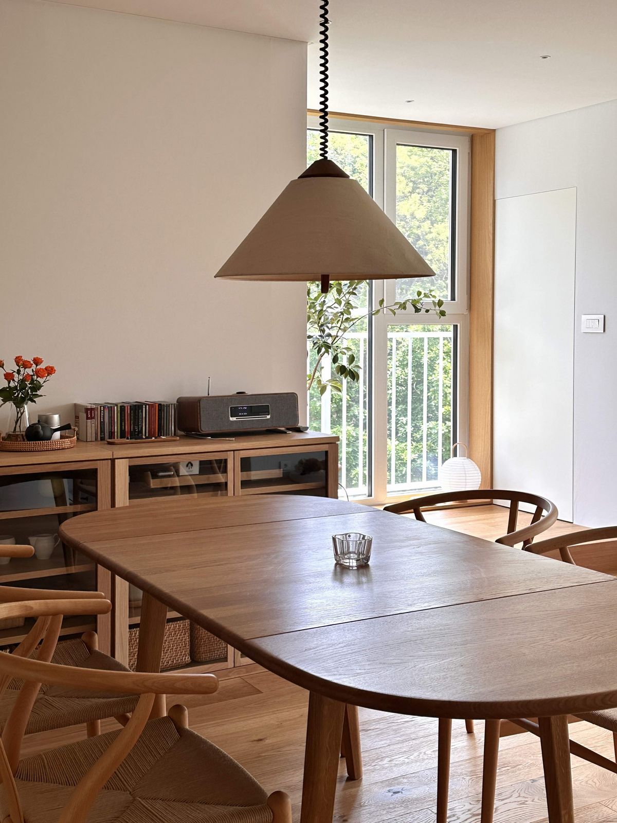 식탁 펜던트 조명도 빈티지예요. 독일 도무스사에서 70년대에 출시한 디자인으로 현재는 단종된 모델이죠. 패브릭 쉐이드가 미색인데 세월의 빛을 켜켜이 쌓아온 것처럼 멋스러워요. 쉐이드 안쪽에는 조명의 높낮이를 조절할 수 있는 우드 핸들도 숨어 있어요.