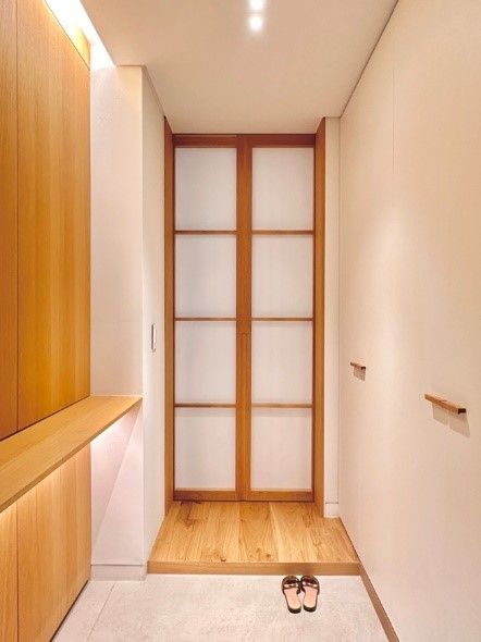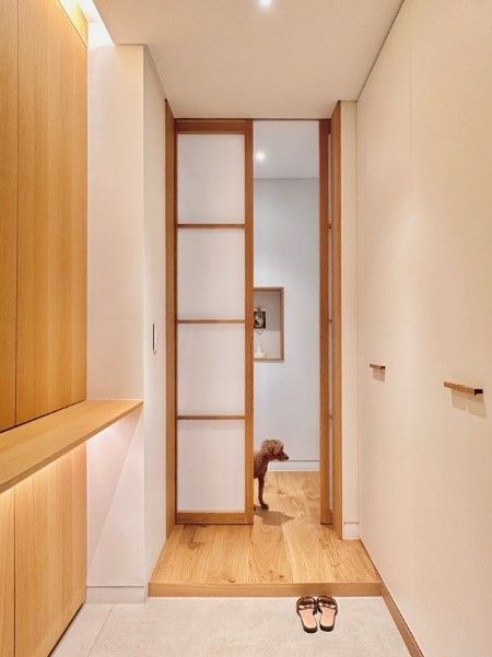 현관은 그 집의 첫인상이라고 하잖아요? 문을 열고 집에 들어갔을 때 단정하고 포근하길 바랐어요. 슬라이드가 아닌 미닫이 형식으로 설치했고, 거실의 접이식 도어 디자인을 그대로 활용해 연결감을 주었어요. 단정한 첫인상