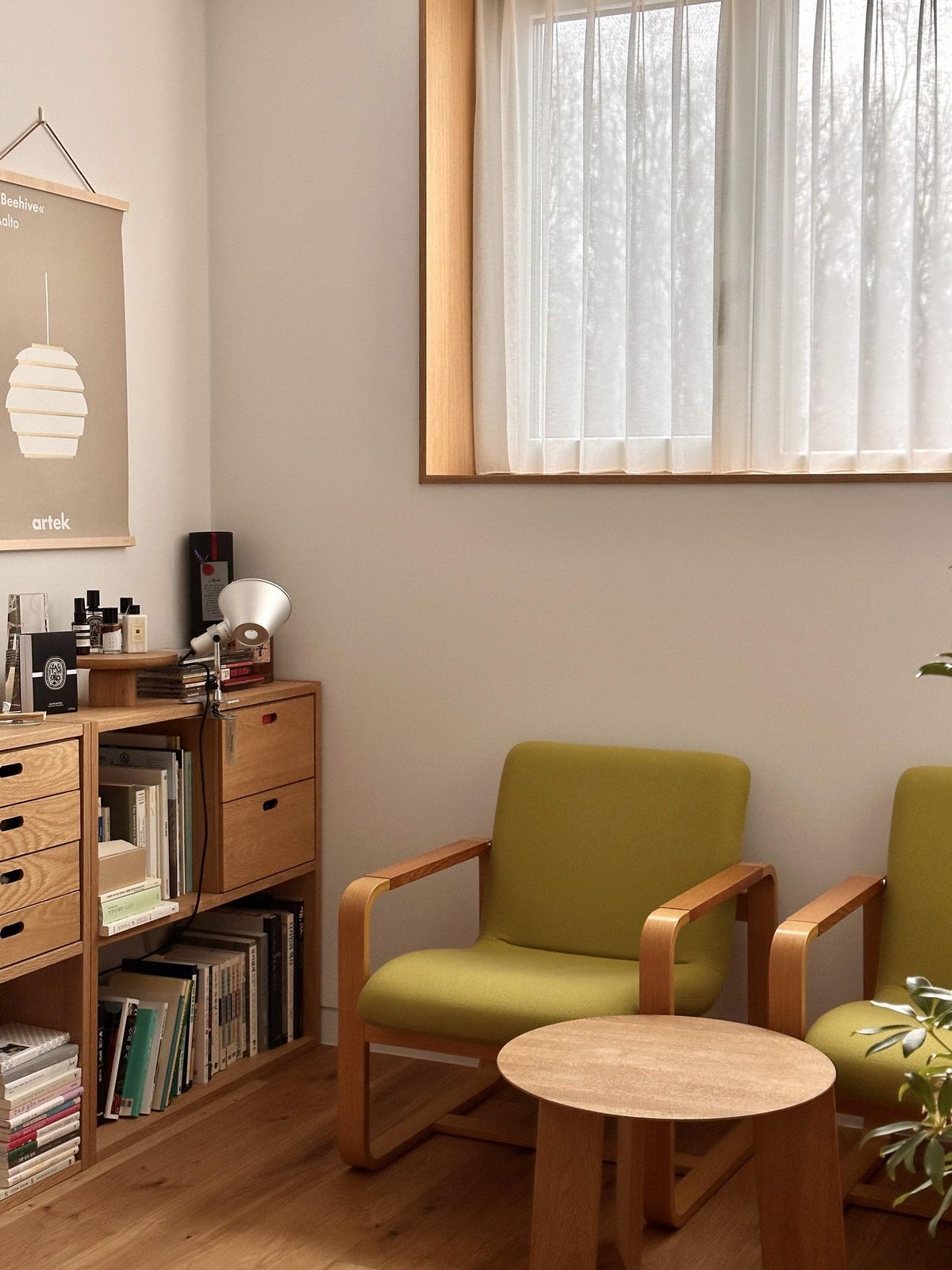 거실 체어는 일본의 텐도 목공이라고 하는 가구 회사에서 생산됐다가 단종된 모델인데요. 운이 좋게도 국내에 겨우 네 점 입고된 것 중 두 점을 제가 소장하게 됐어요. 투자 가치가 있는 유명한 빈티지 가구는 아니지만 경쾌한 듯 차분한 그린 컬러가 너무 매력적이에요.