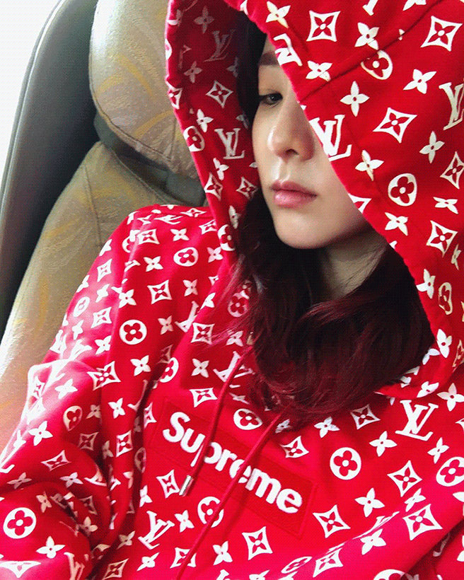 산다라와 마돈나는 자신의 인스타그램 계정에 루이 비통의 모노그램과 슈프림의 빨간 로고 박스를 더한 후디를 입은 셀피를 공개했다. 누구에게 더 잘 어울리는지는 보는 사람의 몫.
