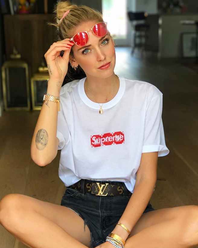 패션 블로거 키아라 페라그니는 루이 비통과 슈프림이 협업한 반소매 티셔츠와 로고 벨트를 함께 스타일링했다.