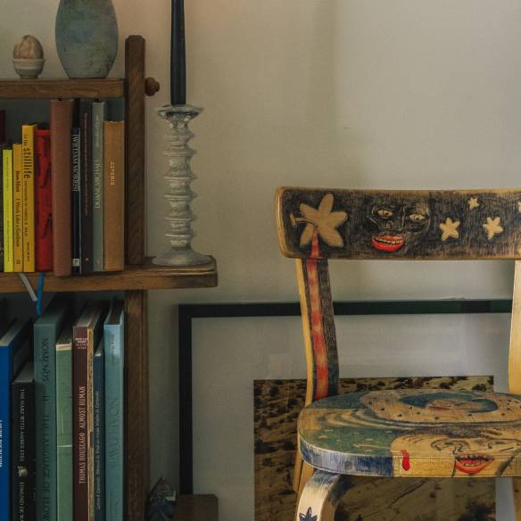 책장은 기에름 에 샤브롱(Guillerme & Chambron). 책장 위의 세라믹 화병은 엘리스 게틀리페(Elise Gettliffe). 레진으로 만든 달걀은 피에르 지라우동(Pierre Giraudon). 캔들 스틱은 이딸라. 오르페오 타기우리(Orfeo Tagiuri)가 그림을 그린 체어는 아르텍. 사진 프레임은 존 발데사리(John Baldessari)의 작품.