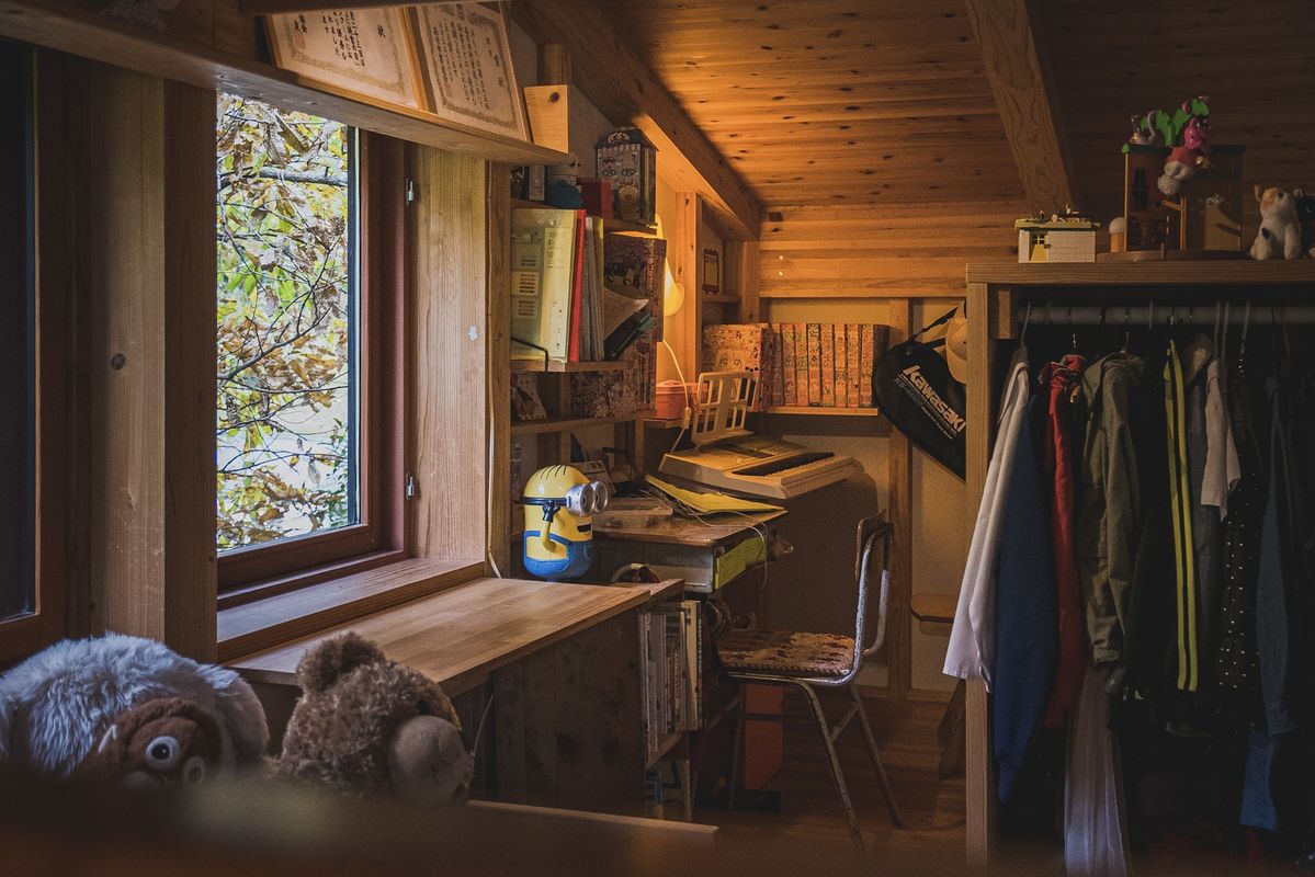 2층에는 침실, 아이들 공간, 수납공간, 그리고 욕실이 있습니다. 천장 높이가 지붕 모양과 같아 남쪽은 낮고 북쪽은 높은 구조입니다. 천장이 낮은 쪽에 침실을 두어 아이들이 아늑하게 감싸진 공간에서 편안히 잠들 수 있도록 했습니다. 아이들의 꿈이 자라나는 다락방