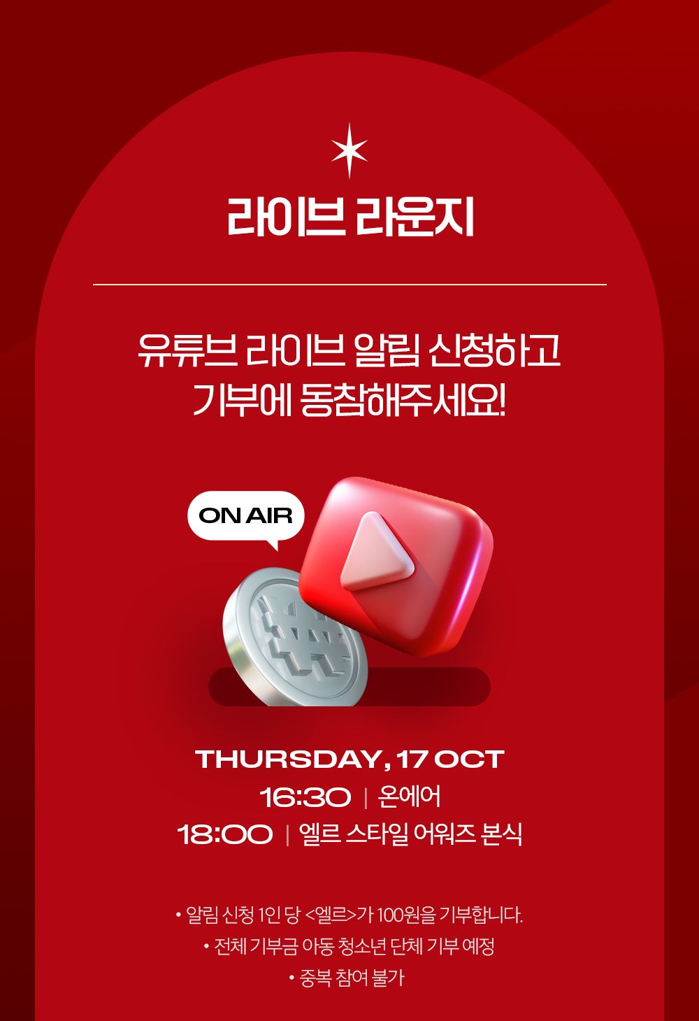 패션, 문화, 예술, 커리어, 라이프스타일 등 다양한 곳에서 자신만의 ‘스타일’을 구축해 성취를 이룬 인물들이 모인 자리인 만큼 모두의 꿈을 독려하는 뜻 깊은 기부가 진행됩니다. 참여 방법도 간단해요. 엘르 유튜브 채널에서 라이브 알림을 신청하면, <엘르 코리아>가 알림 신청 1인 당 100원을 기부합니다. 모인 기부금은 아동·청소년 후원 단체에 전액 전달돼요.