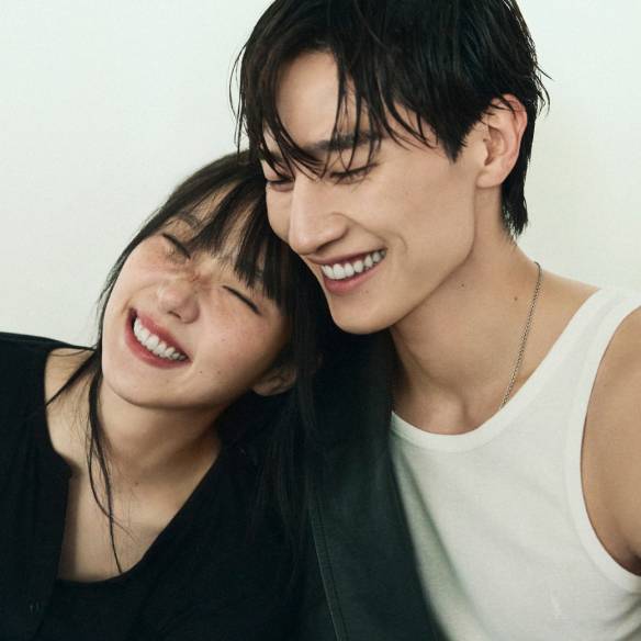 김고은이 입은 보디수트는 Acne Studios. 데님 팬츠는 Golden Goose. 스웨이드 재킷은 Arket. 메리 제인 슈즈는 Lemaire. 미니 링은 Chanel Fine Jewelry. 노상현이 입은 레더 재킷은 Lemaire. 이너 웨어로 입은 슬리브리스는 Saint Laurent. 데님 팬츠와 부츠는 모두 Celine.