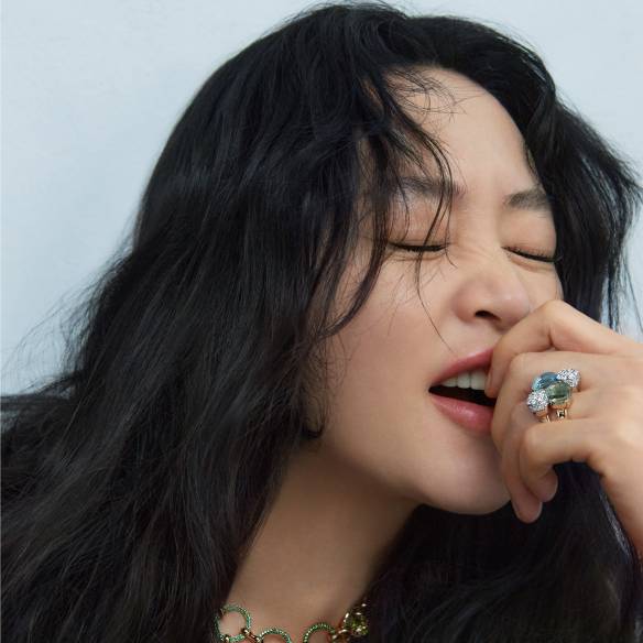 ‘투트 라 브이’ 수트 세트업은 Valentino. 브이로고 시그너처 글러브, 플라워 아플리케의 ‘플레르 루미너스’ 네크리스는 모두 Valentino Garavani.
