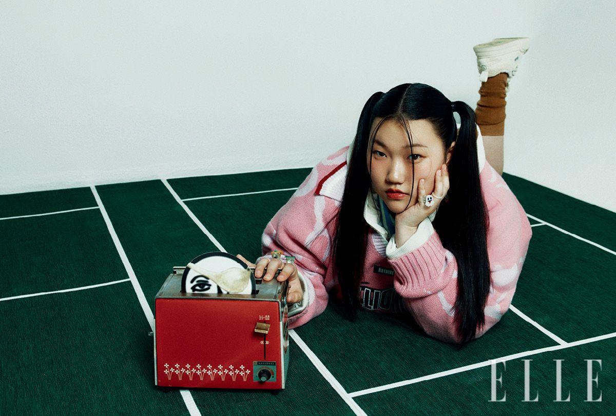 핑크 칼라 니트 톱과 머리에 두른 멀티컬러 니트 톱은 모두 Roynine. 이너 웨어로 입은 스트라이프 셔츠는 Hydrogen. 이너 웨어로 입은 후디드 집업은 Langer. 슈즈는 Ouder. 팬츠와 삭스는 모두 스타일리스트 소장품. 해골 링은 모델 소장품.