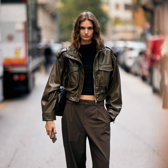 할리우드에서 옷 잘 입기로 유명한 클로에 세비니가 선택한 오버사이즈 가죽 보머 재킷은 피비 필로의 디자인입니다. 그는 보머재킷의 볼드한 실루엣만으로 존재감을 뽐냈습니다. 둥근 옷깃과 가슴팍에 달린 주머니가 특징인 이 보머 재킷은 물결처럼 퍼진 플레어 디테일 덕에 마치 스커트를 입은 효과를 내는 게 특징인데요. 세비니 역시 하의가 보이지 않게 늘씬한 다리를 노출하고 미니멀하게 연출함으로써 되려 드라마틱하게 룩을 완성했습니다. 볼드한 가죽 보머 재킷을 가지고 있다면 그처럼 베이식한 액세서리만으로 룩의 밸런스를 유지해보세요. CHLOE SEVIGNY