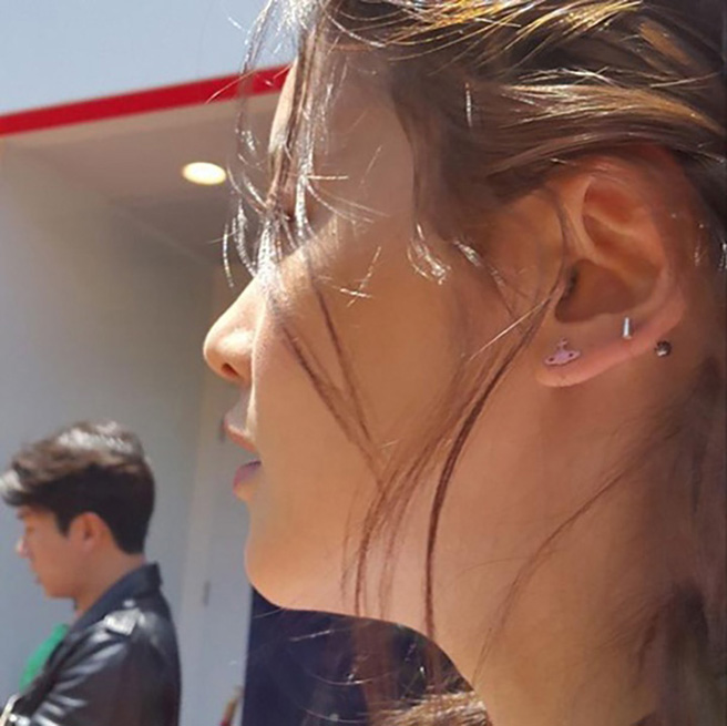 양쪽 귀 모두에 피어싱이 있을 정도로 고통을 마다하지 않는 오연서. 오른쪽 귀는 스탠다드 로브와 스너그, 왼쪽 귀는 스탠다드 로브와 어퍼 로브를 뚫었다. 왼쪽 귀의 비비안 웨스트우드 모티프 피어싱처럼 컬러풀한 것과 간결한 아이템을 섞어 매치했다.