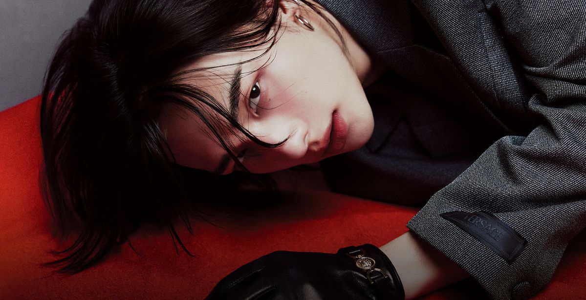 그레이 수트 재킷과 메두사 로고 디테일의 레더 글러브는 모두 Versace.