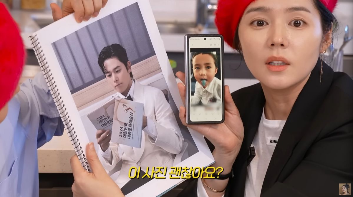 이윽고 식사에 나선 두 사람은 서로의 사진들을 감상하며 놀람을 감추지 못했어요. 전설의 빨간 베레모를 나눠 쓴 두 사람은 얼굴 바꾸기 어플을 사용해 보기도 했습니다. 그런데 너무 닮은 나머지 얼굴이 바뀌었는지 안 바뀌었는지 한참을 쳐다봐야 했습니다. 여기에 한가인은 그 동안 보여준 적 없는 아들 사진을 꺼내 김동준과 비교했는데요. 한가인과 그가 꺼낸 아들 사진, 그리고 김동준이 나란히 붙어 있는 광경은 그야말로 신비로움 자체였습니다.
