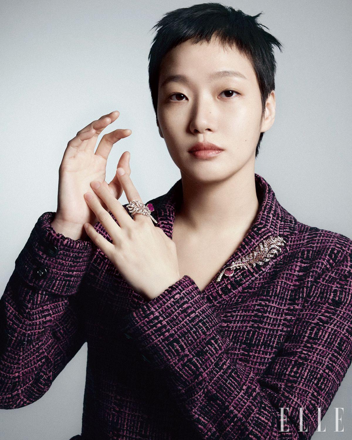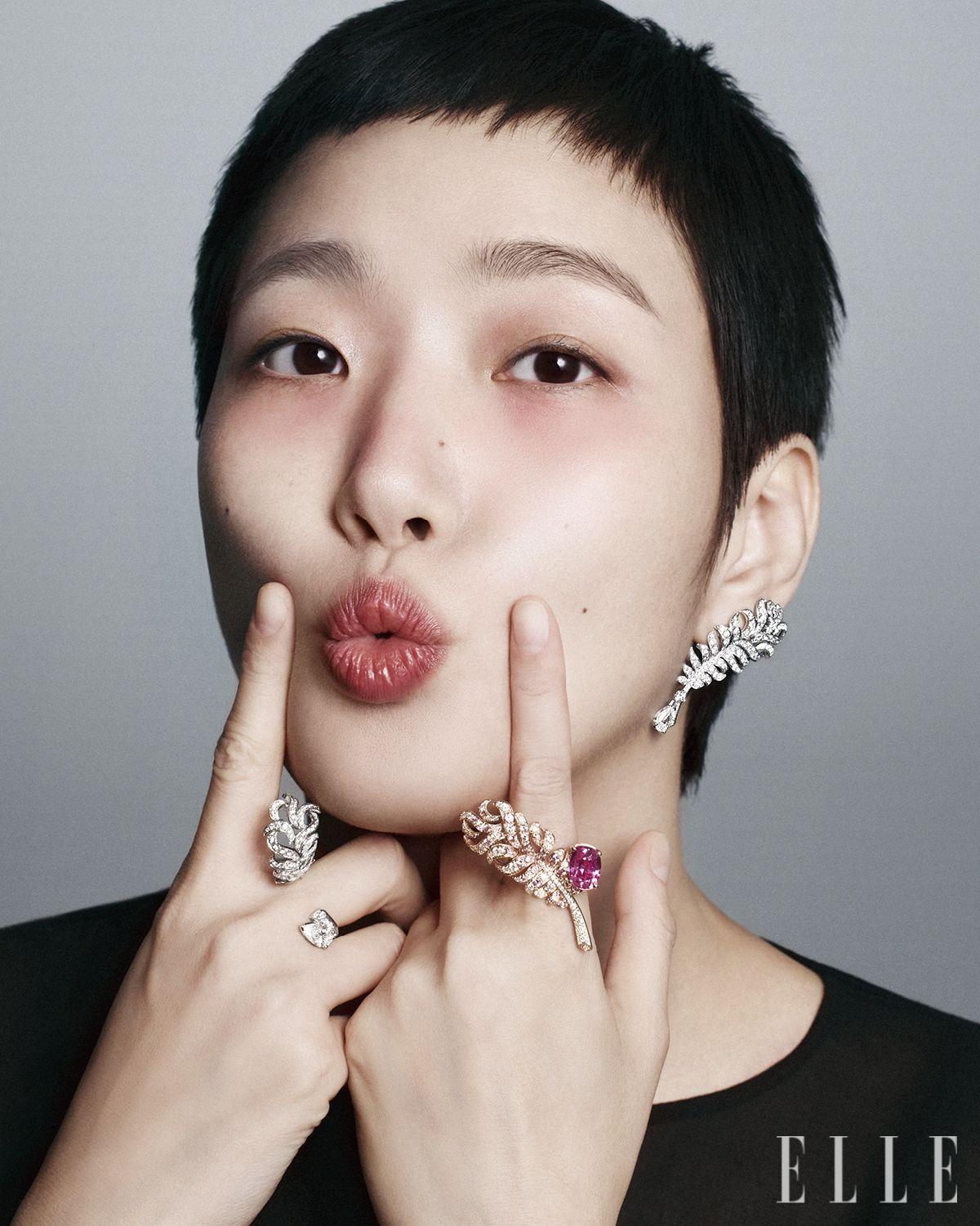 화이트골드와 18K 핑크골드에 깃털 모양으로 다이아몬드를 세팅한 플륌 드 샤넬 하이 주얼리 컬렉션 헤드 주얼리, 18K 화이트골드와 핑크골드에 다이아몬드와 팬시 인텐스 퍼플리시 핑크 다이아몬드를 세팅한 플륌 드 샤넬 2024 하이 주얼리 컬렉션 링은 모두 Chanel High Jewelry.